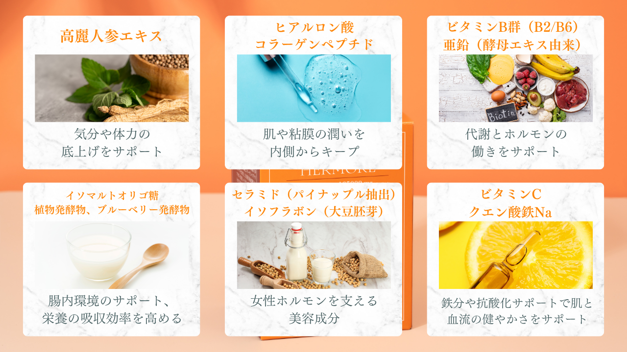 ヒアルロン酸/コラーゲンペプチド:内側からうるおいと弾力をキープ。