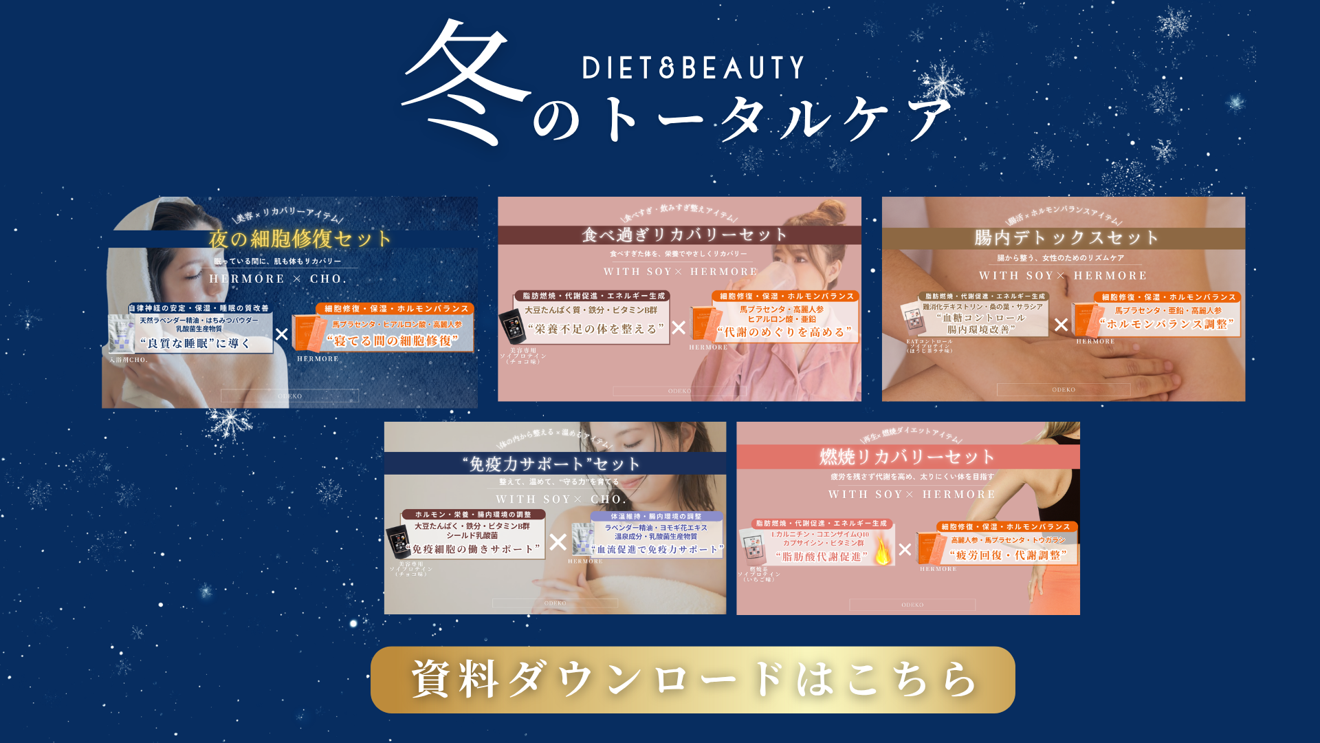 HERMOREでホルモンバランスや美容面もケア。「腸から整えて、溜め込みにくいカラダ」を目指すセットです。