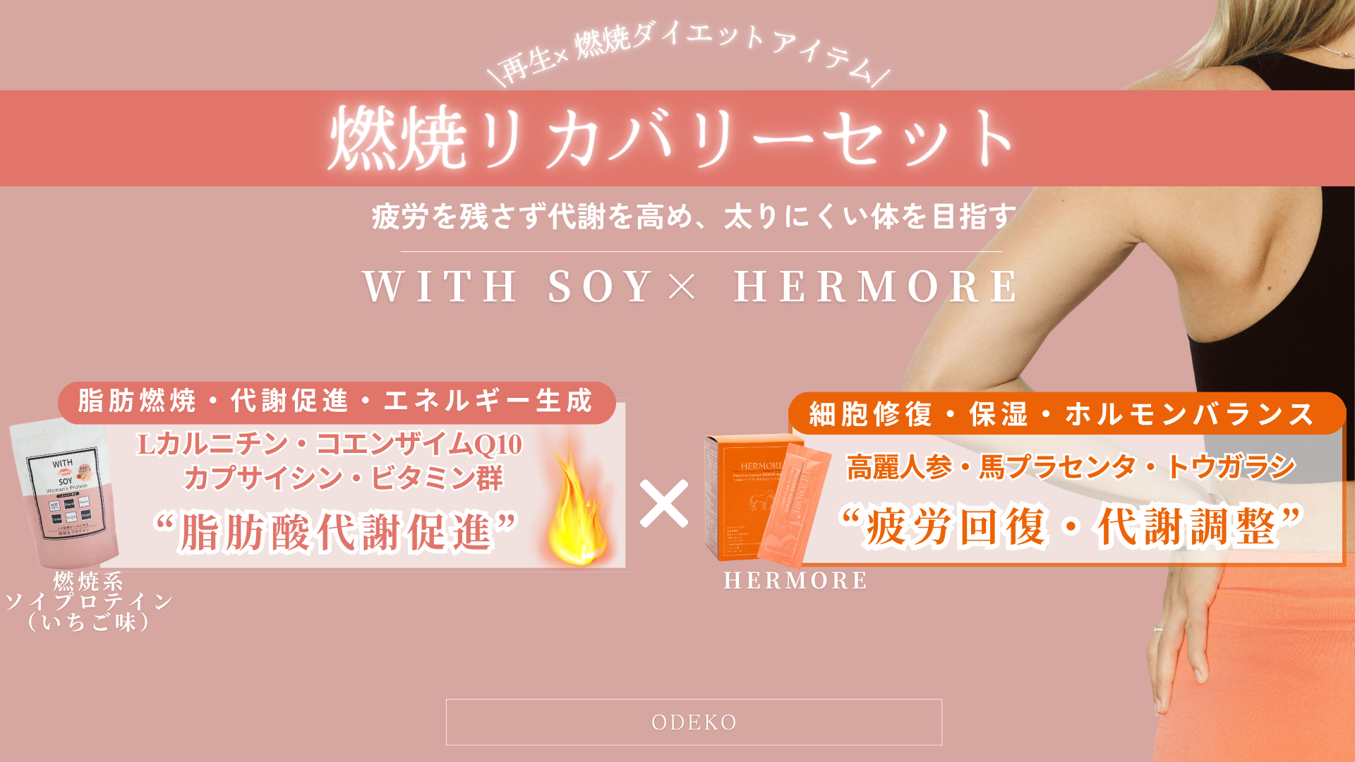 セットのポイント:脂肪燃焼をサポートするソイプロテインと、細胞リカバリーをサポートするHERMOREの組み合わせ。